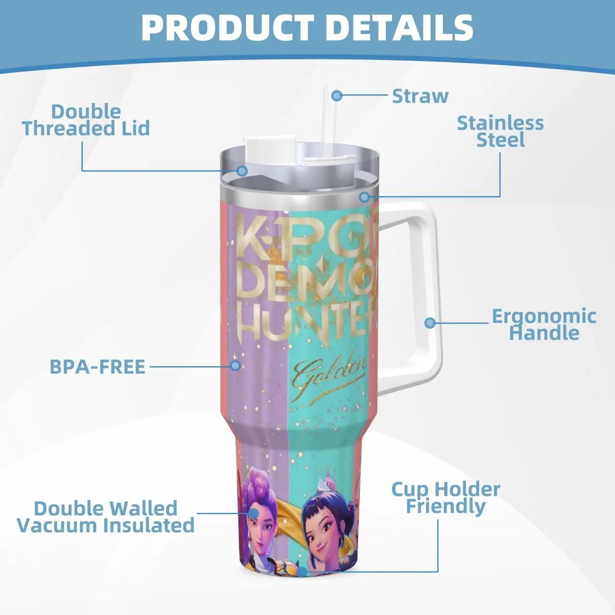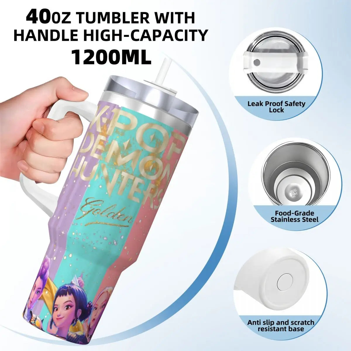 Stay refreshed and show off your Kpop fandom with the Demon Hunters Golden Huntrix thermal cups. Perfect for beach days or any outing, these tumblers are a must-have for any Kpop enthusiast!